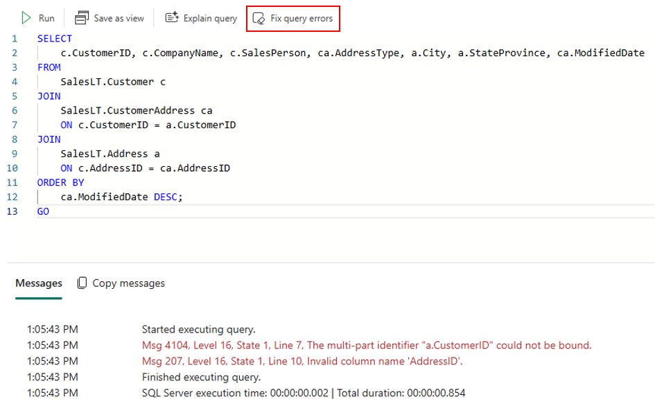 The Fix quick action fixes errors in your query syntax or logic. After running a SQL query and being met with an error, you can fix your queries easily. Copilot automatically takes the SQL error message into context when fixing your query. Copilot also leaves a comment indicating where and how it has edited the T-SQL code.