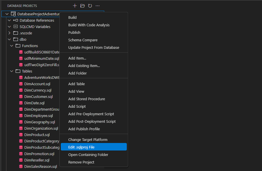 .sqlprojfile. On the prompt to reload your database project, select Yes.