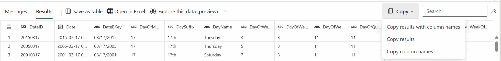 The Copy dropdown list allows you to copy the results and column names in the data grid. You can choose to copy results with column names, just copy the results, or just copy the column names.