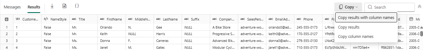 The Copy dropdown list allows you to copy the results and/or column names in the data grid. You can choose to copy results with column names, just copy the results only, or just copy the column names only.