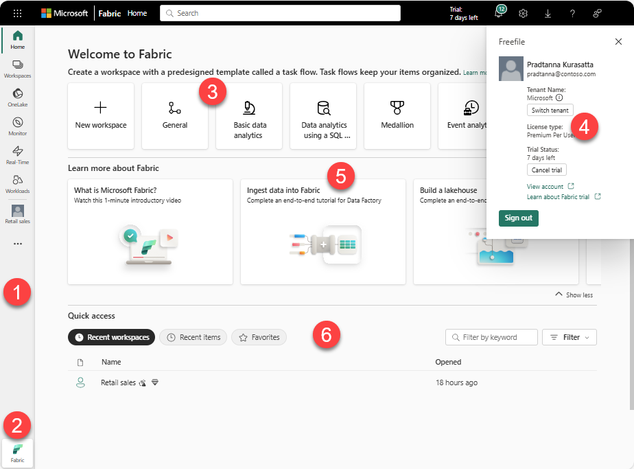 - If task flow templates are enabled in your tenant, they appear in the first row on Home to help you start structured solutions. See Task flows in Microsoft Fabric.