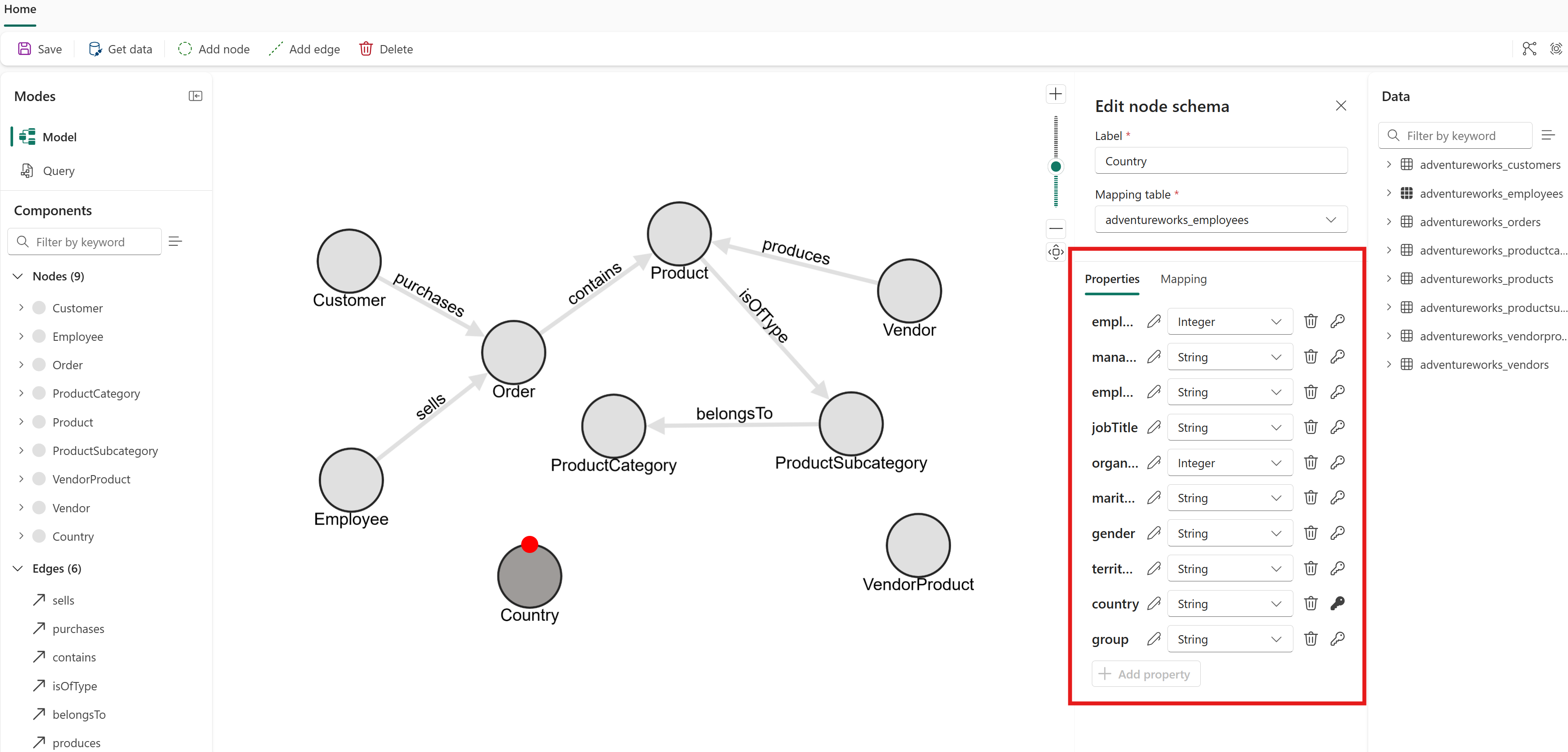 Countrynode type to view its properties.All 10 columns from the Employees table become properties by default. Delete the ones that aren't relevant to a country. Specifically, remove