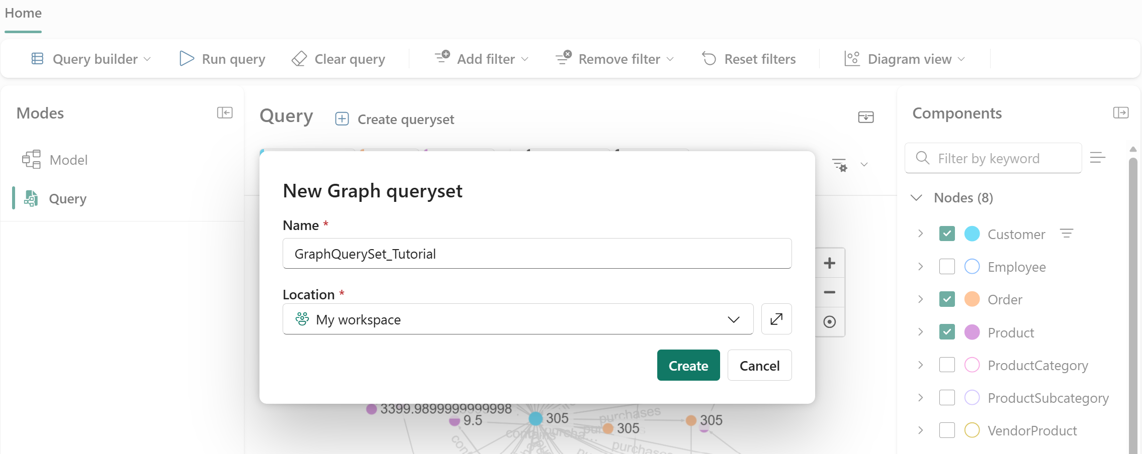 In the New graph queryset dialog, enter a name for your queryset (for example, "GraphQuerySet_1") and set Location to your workspace. Then select Create.