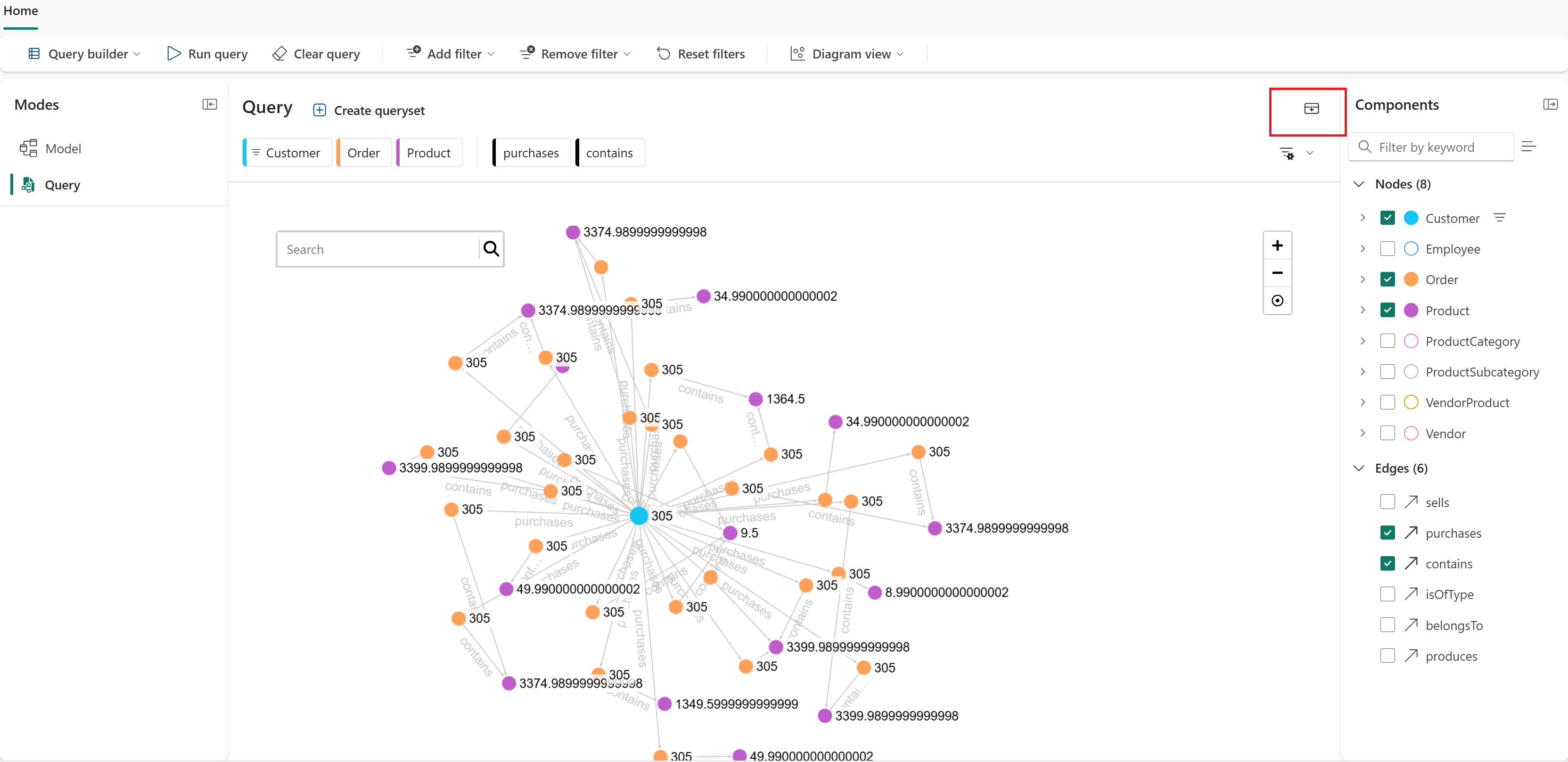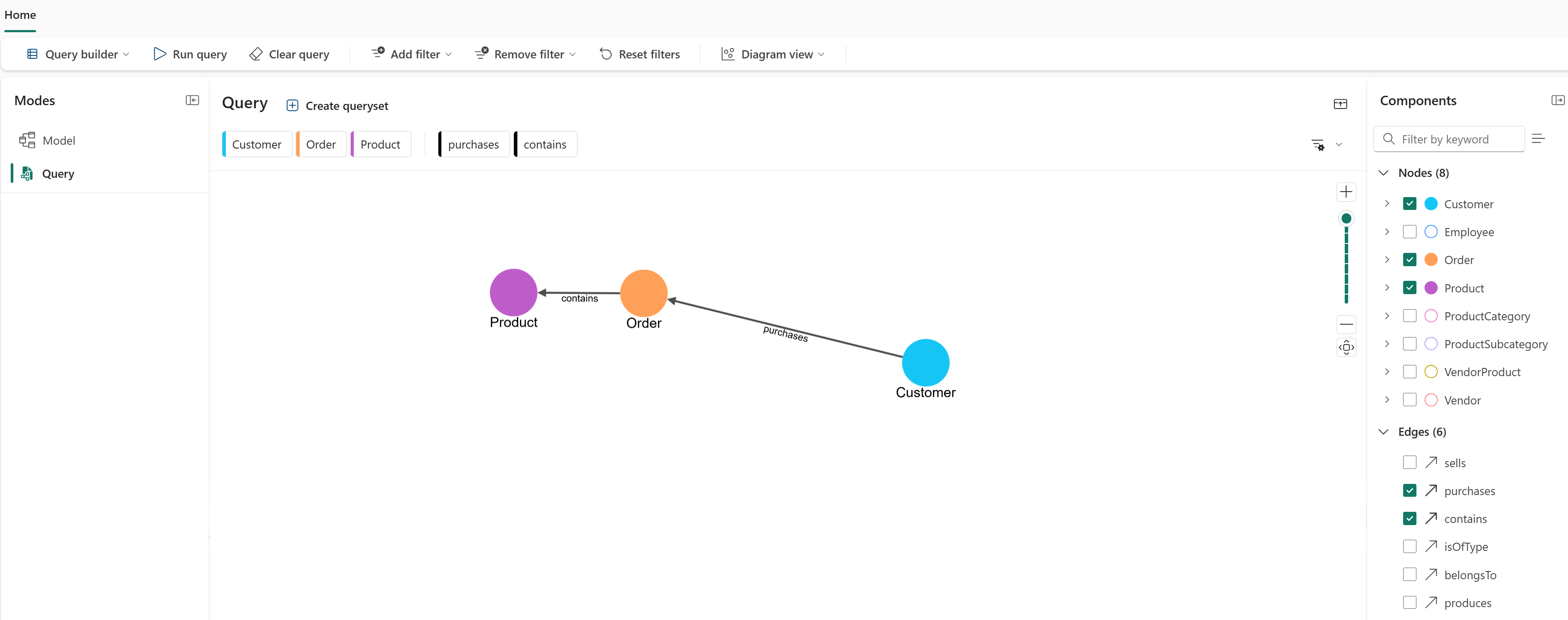 purchasesedge while theCustomernode is selected. The query builder automatically adds the connectedOrdernode.Select the