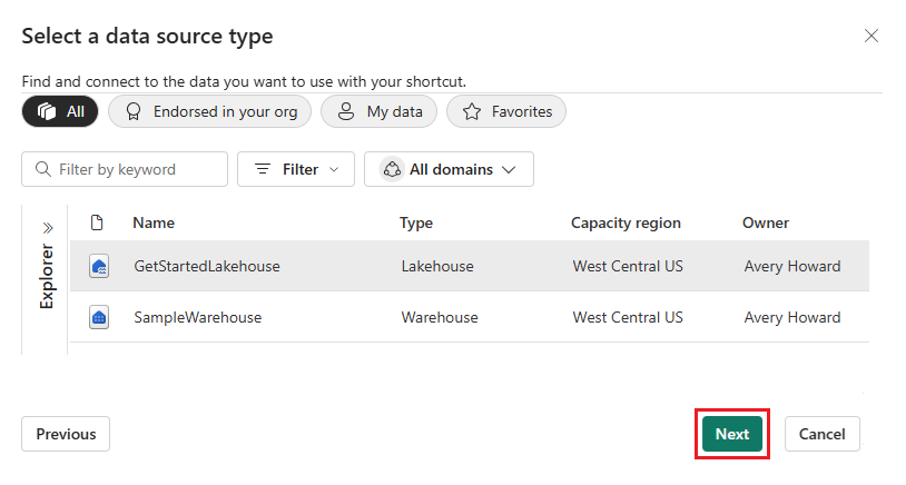 Under Internal sources, select Microsoft OneLake.