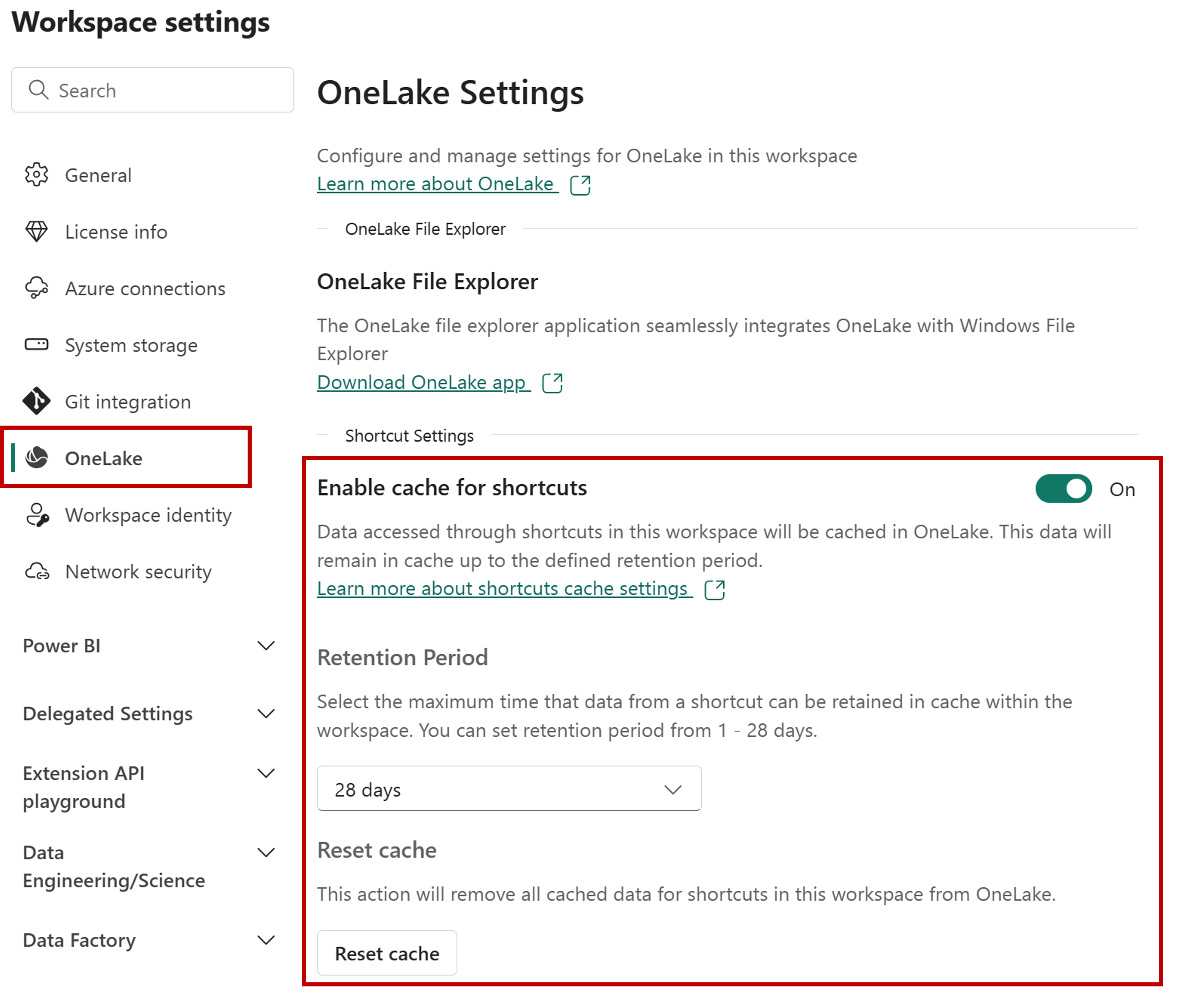 To enable caching for shortcuts, open the Workspace settings panel. Choose the OneLake tab. Toggle the cache setting to On and select the Retention Period.