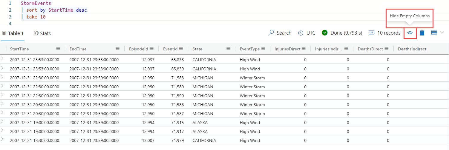 StormEvents | sort by StartTime desc | where DamageProperty > 5000 | project StartTime, State, EventType, DamageProperty, Source | take 10In the results pane, select a few of the numerical cells. The table grid allows you to select multiple rows, columns, and cells and calculate aggregations on them. The following functions are supported for numeric values: Average, Count, Min, Max, and Sum.