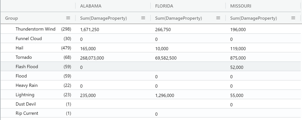Select Pivot Mode, then drag columns as follows: EventType to Row groups; DamageProperty to Values; and State to Column labels.