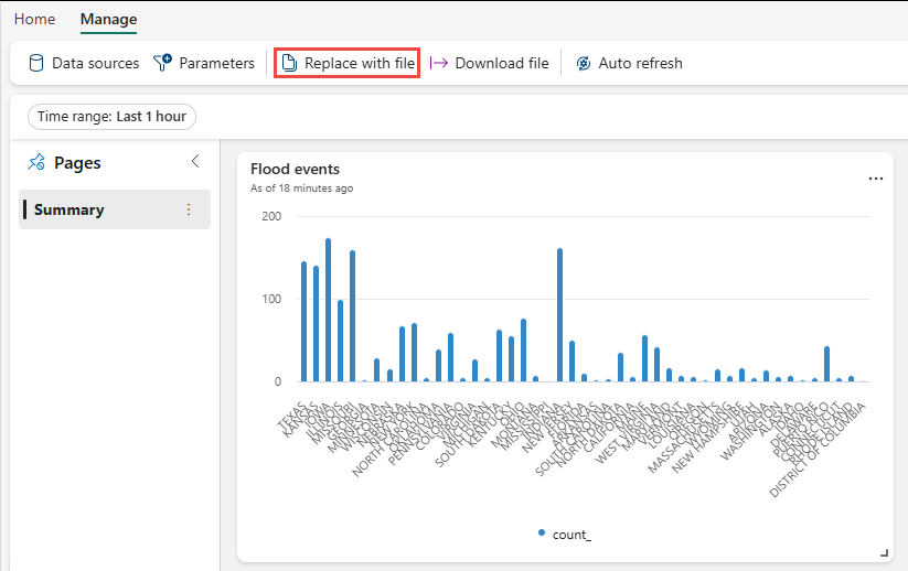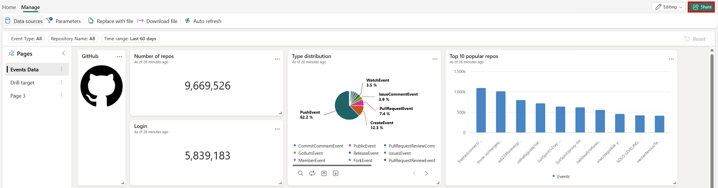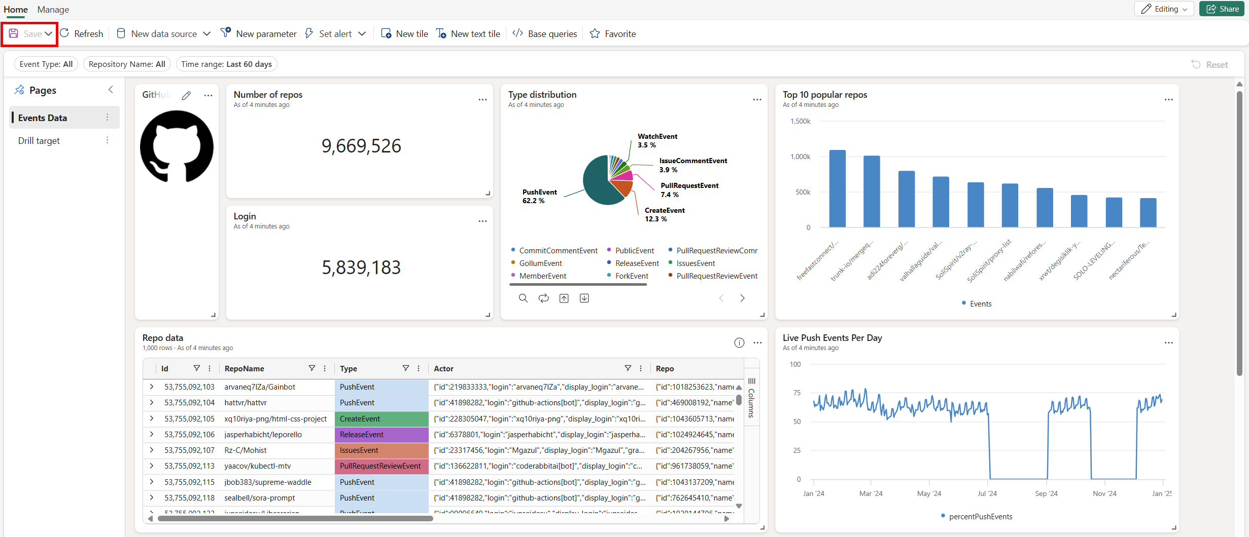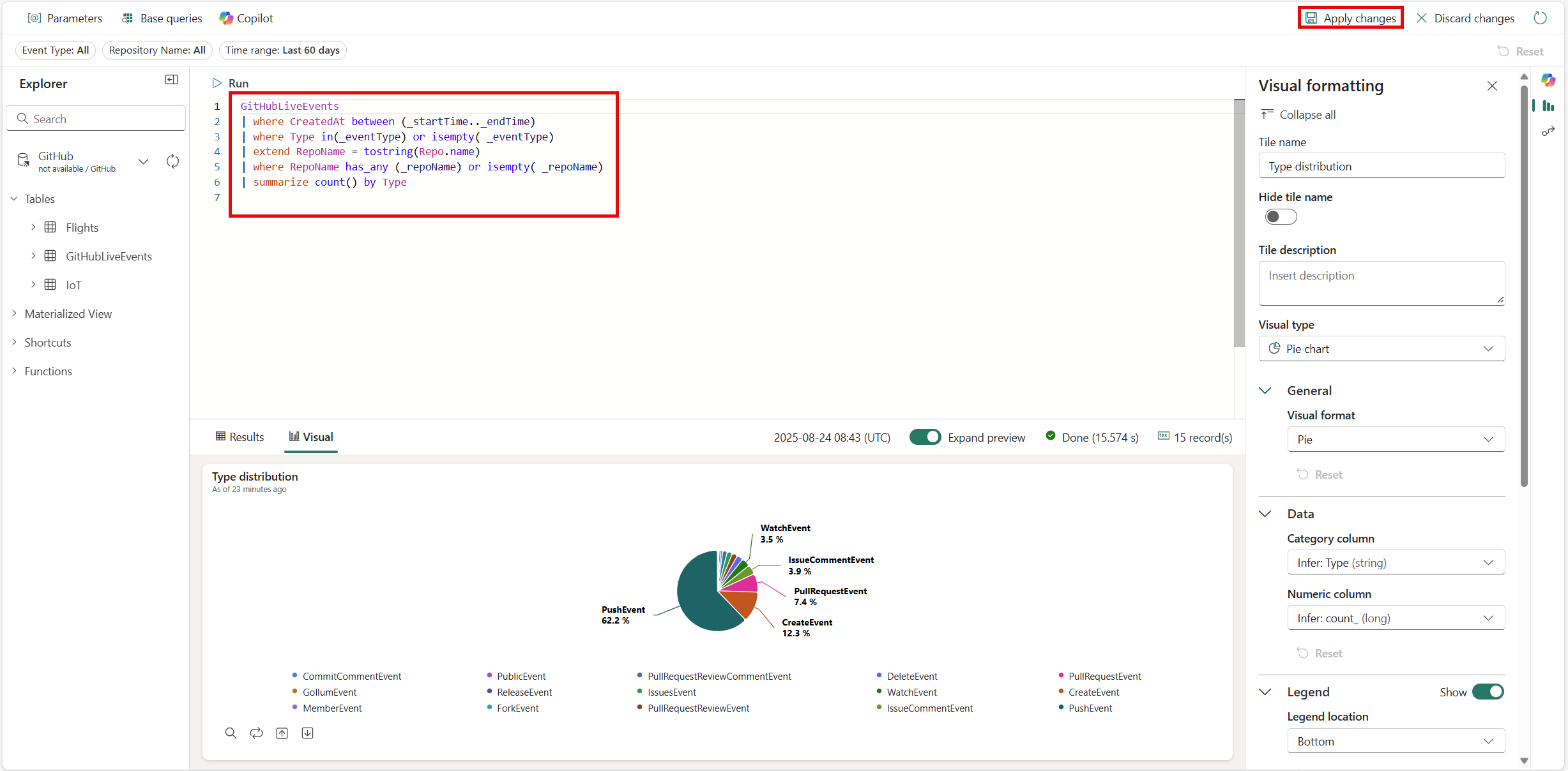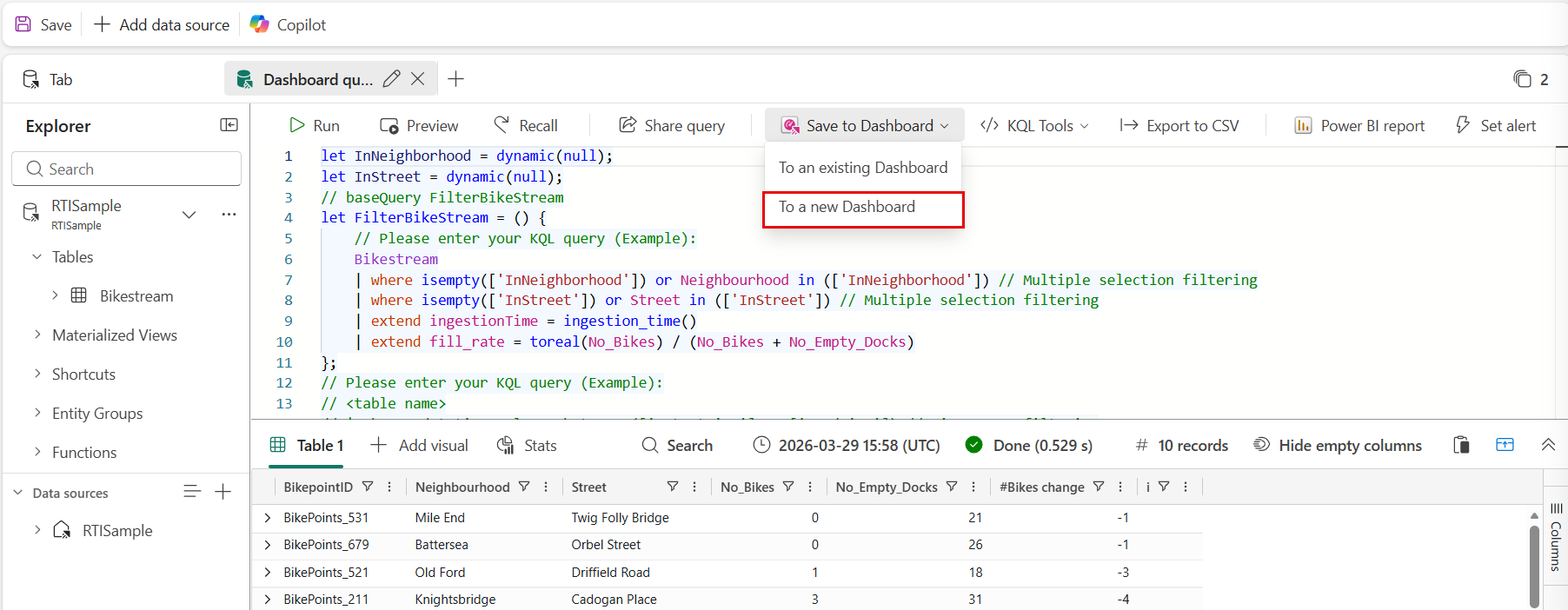 A dashboard is a collection of tiles, optionally organized in pages, where each tile has an underlying query and a visual representation. You can natively export Kusto Query Language (KQL) queries to a dashboard as visuals and later modify their underlying queries and visual formatting as needed. In addition to ease of data exploration, this fully integrated dashboard experience provides improved query and visualization performance. Copilot integration in the dashboard editing experience lets you use natural language to create and modify visuals directly, no KQL expertise required.