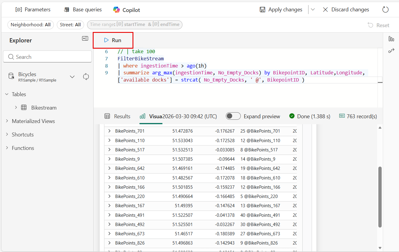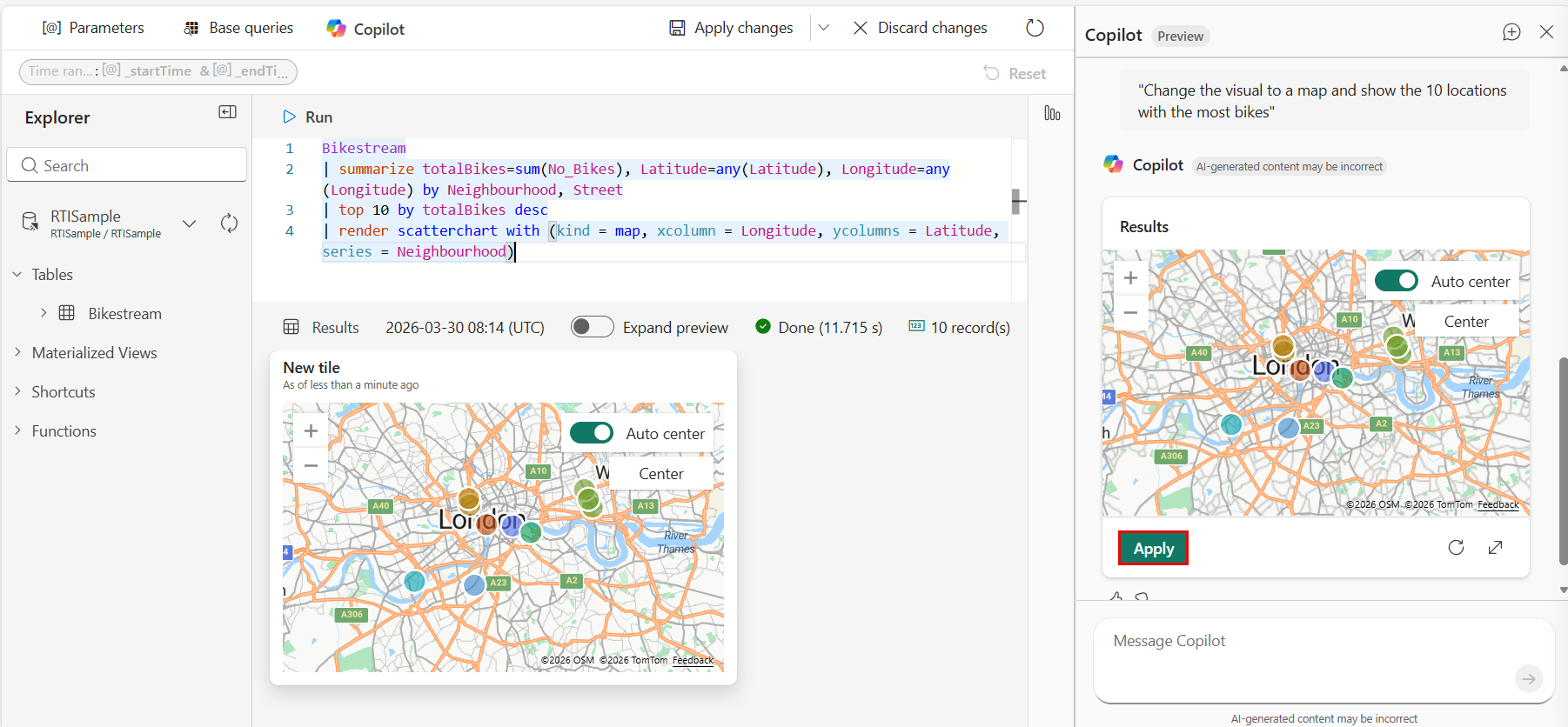 In the Copilot pane, enter a description of the tile in natural language. For example, "View the most available bike points including neighborhood, street name, and number of bikes at the station."