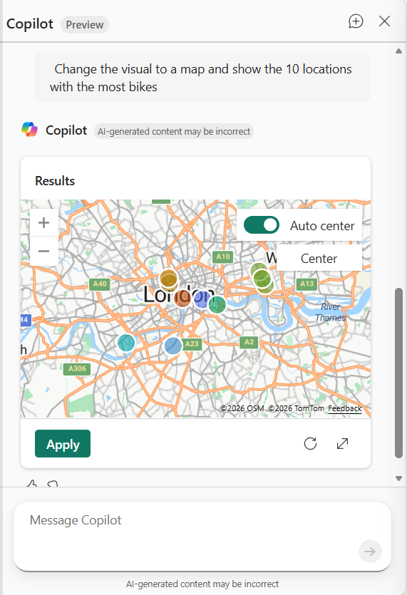 View the result. Refine the result by asking Copilot a follow-up request. In this example, ask Copilot to "Change the visual to a map and show the 10 locations with the most bikes."