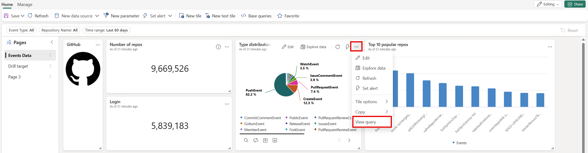 On the tile you want to explore, select the Tile options [...] > View query. A pane opens with the query and results table.