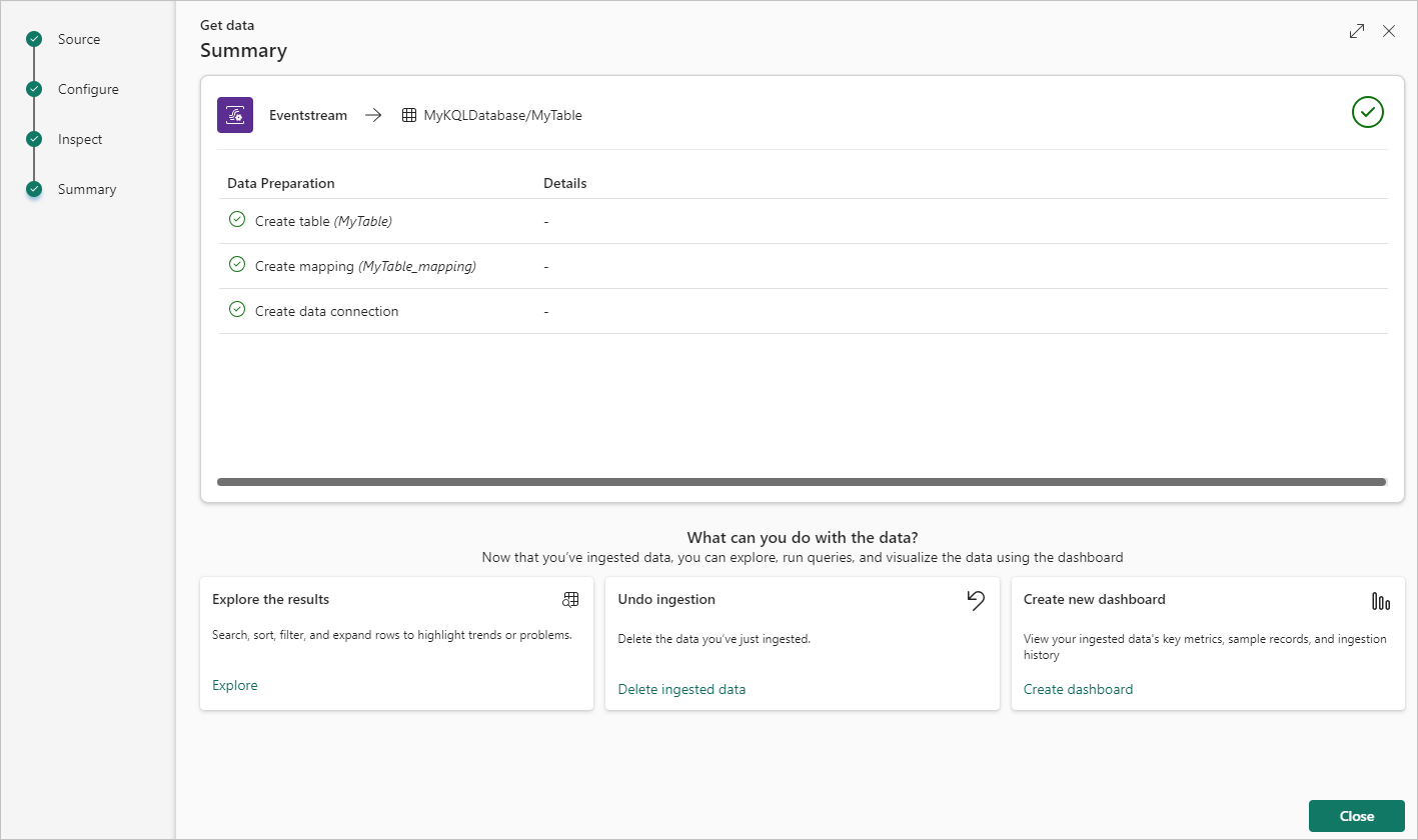 On the Summary screen, review the details and status of your data ingestion, including the table with the schema you defined and the connection between the eventstream and the Eventhouse. Select Close to finalize the Eventhouse setup.