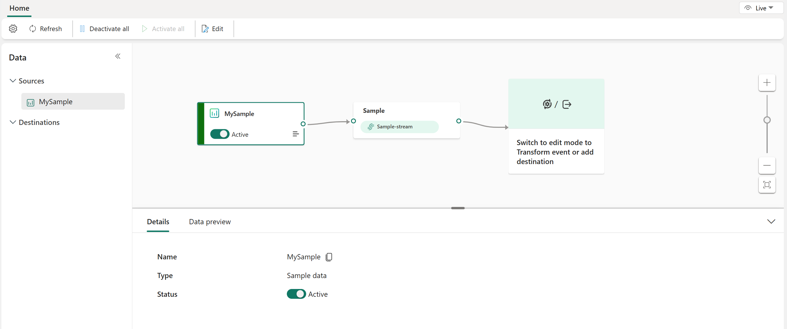 After you create the sample data source, confirm that the source is added to your eventstream on the canvas in Edit mode. To implement this newly added sample data, select Publish.