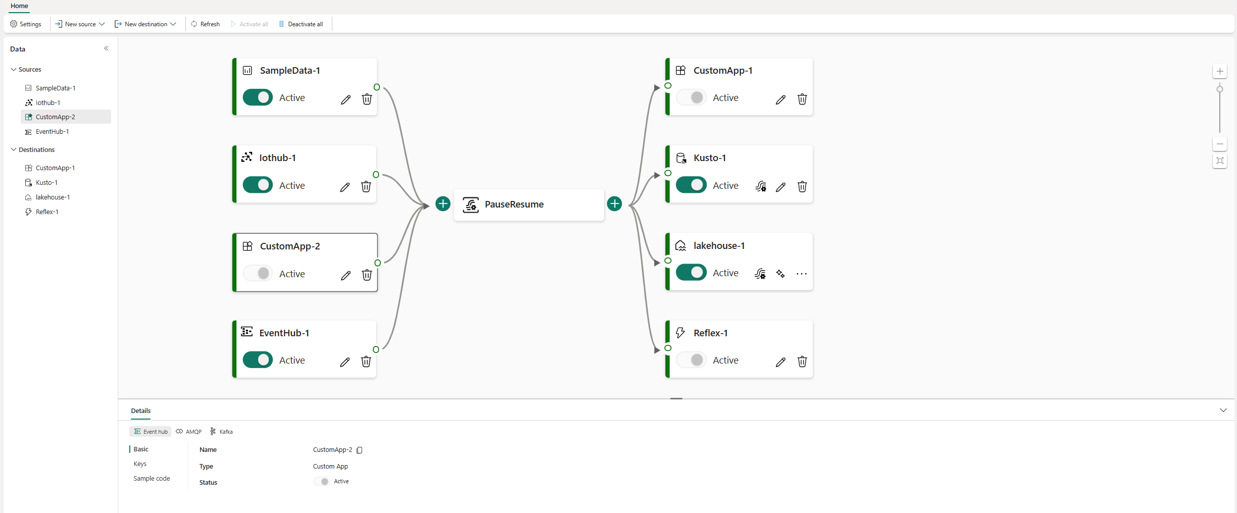 • Pause and resume controls: Derived eventstreams support pause and resume controls, so you can temporarily halt processing without affecting other inputs or outputs in your eventstream and then resume later. For more information, see Pause and resume data streams.