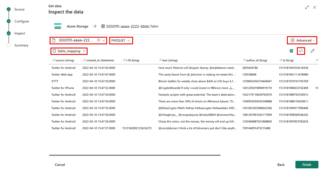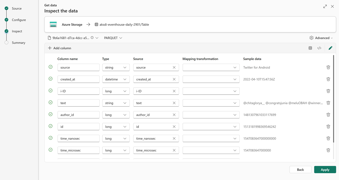 If the data you see in the preview window isn't complete, you might need more data to create a table with all necessary data fields. Use the following commands to fetch new data from your event hub: