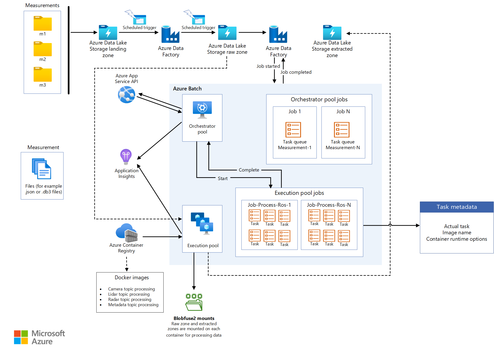 All extraction logic is packaged in different container images, with one container for each extraction process. Batch runs the container workloads in parallel when it extracts information from measurement files.
