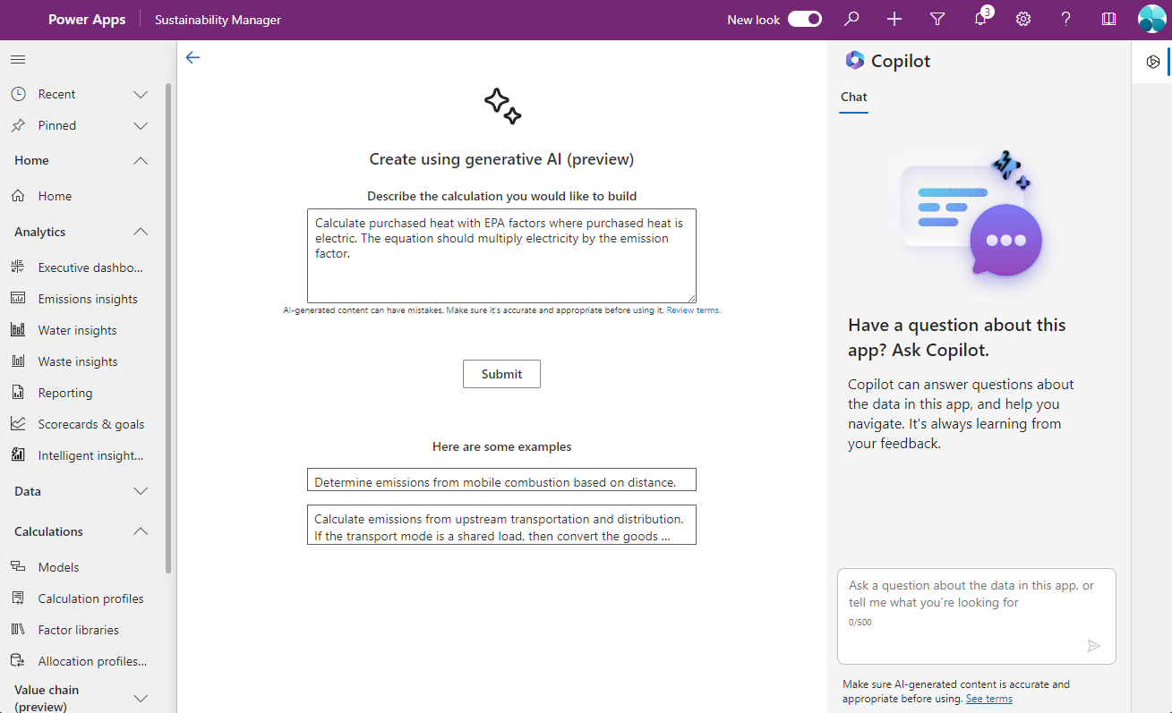 By using Copilot in Microsoft Sustainability Manager (preview), you can use natural language to generate calculation models.