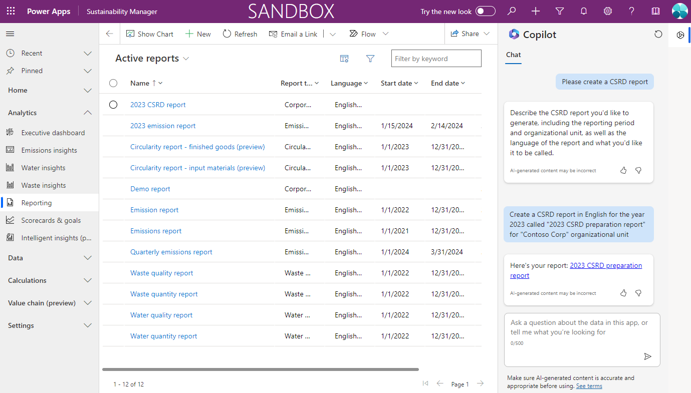 By using Copilot in Microsoft Sustainability Manager (preview), you can use natural language to generate emissions and Corporate Sustainability Reporting Directive (CSRD) reports.
