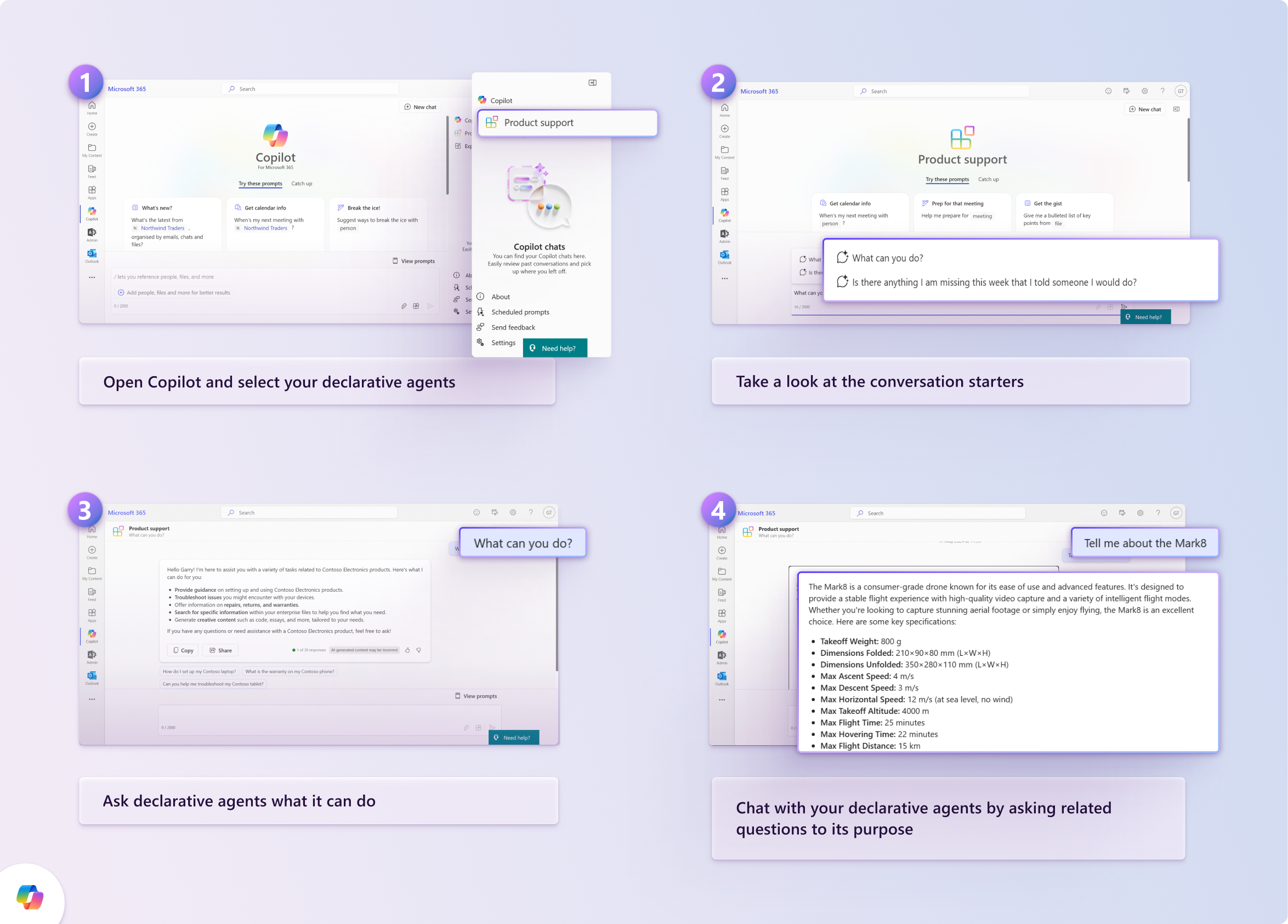 - Familiar UI - Declarative agents use the same friendly UI within Microsoft 365 Copilot. Users can adopt and engage with agents tailored to their business scenarios that look and feel like Microsoft 365 Copilot.