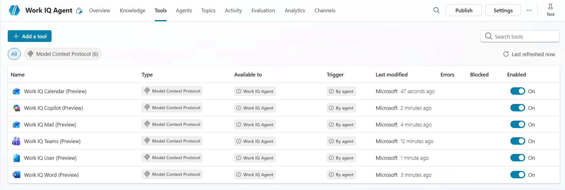 You can connect your agent to multiple Work IQ tools in Copilot Studio. The following steps guide you through the process of adding the Work IQ Mail MCP server tool to your agent. This tool provides your agent with insights and context from your emails, so it can understand and act on email content in a more informed way.