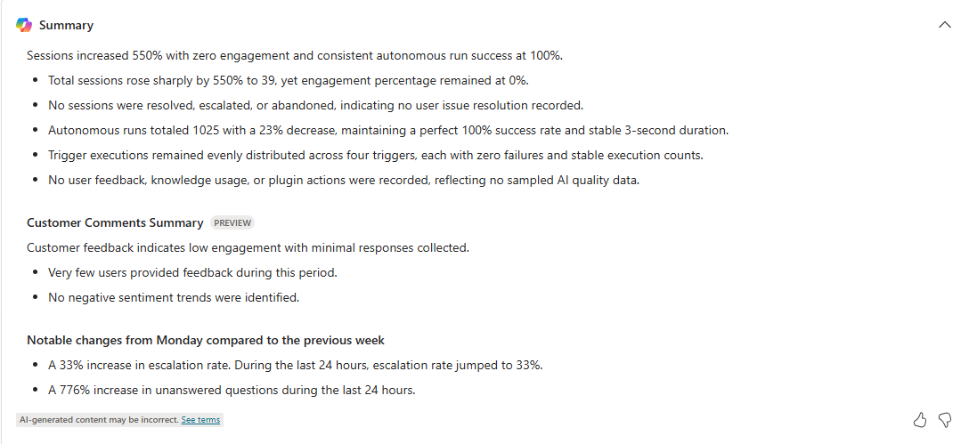 It helps you quickly understand common themes and metrics and identify areas for improvement for your agent by summarizing them in a bulleted list for the selected reporting period. This can include engagement metrics, customer sentiment and feedback, and trends since the last reporting period.