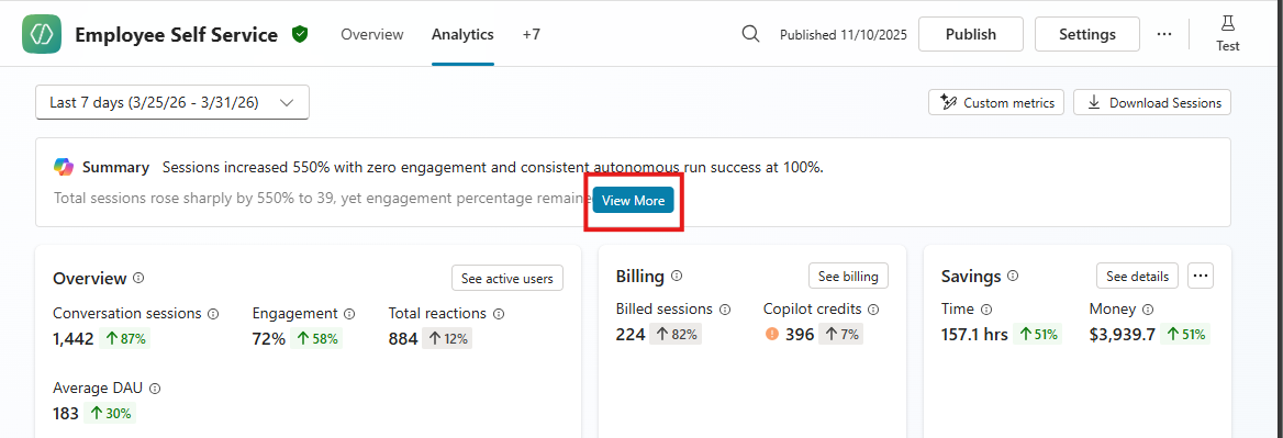 The Summary area uses Copilot to generate an AI summary of key analytics insights about your agent. Select View More to see the full summarized list of insights.