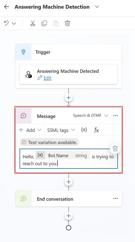 You can configure your agent to detect an answering machine and leave a message with the agent user after the agent user's message finishes. The Answering Machine Detection system topic allows you to create a custom message for scenarios when your agent encounters a user's voice mail. In the Message node, define the message that's left when the agent encounters an answering machine.