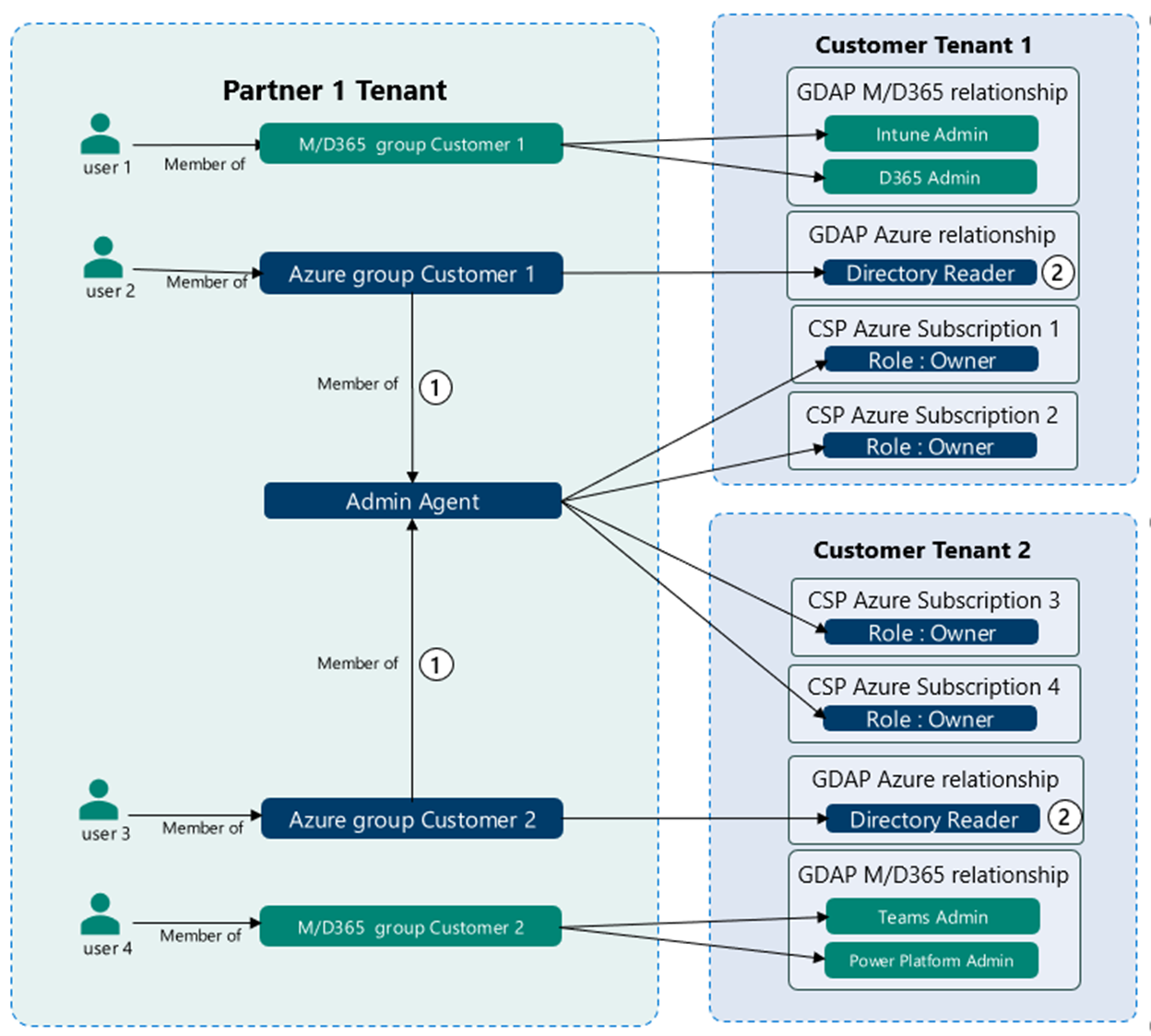 You can partition partners' access per customer. With GDAP, partners no longer have access to all customer tenants across Azure subscriptions through Admin agents by default. Instead, partners who manage Azure are part of a separate security group, which is a member of the Admin agent group. This group grants owner role-based access control (RBAC) access on all Azure subscriptions for that customer.