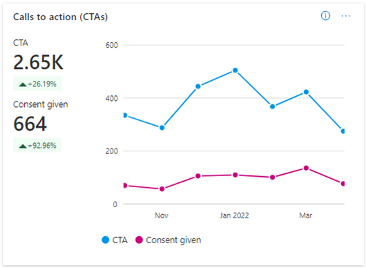 This number represents the count of Call to Action button clicks completed on the offer listing page (product detail page). Calls to action are counted when users select the Get It Now, Free Trial, or Contact Me buttons. Consent given represents the total count of clicks for customer-provided consent to Microsoft or the partner.