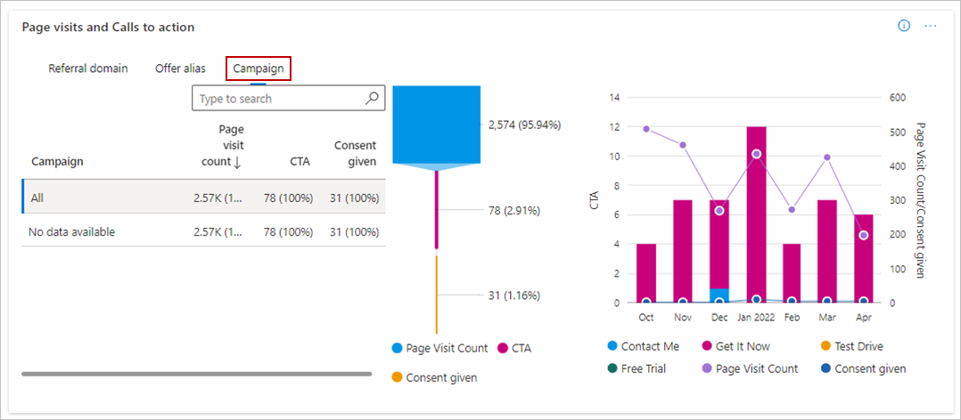 By selecting a specific campaign identifier on the Campaign tab, you should be able to understand the success of the campaign. Each campaign is identified by a unique combination of OCID and UTM parameter tags. For more information on setting up campaign information see Best practices for marketing and listing your offer. For each campaign, you should be able to see the monthly trend of page visits, calls to action, and consent-given clicks on the chart.