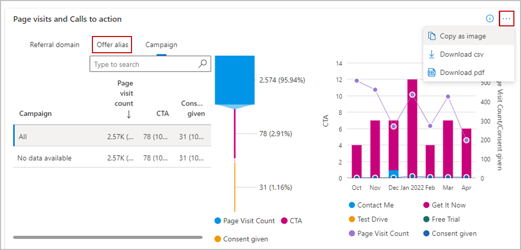 Select the Offer alias tab to select a specific offer to see the monthly trend of page visits, calls to action, and consent-given clicks on the chart.
