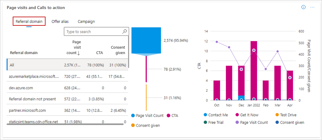 Selecting a specific referral domain on the Referral domain tab shows the monthly trend of page visits, calls to action, and consent clicks on the chart to the right. Additionally, there's a column for Platform – website and client, which displays for Marketplace offers only. The funnel view depicts the conversion rates among page views, calls to action, and consent-given clicks on the chart.