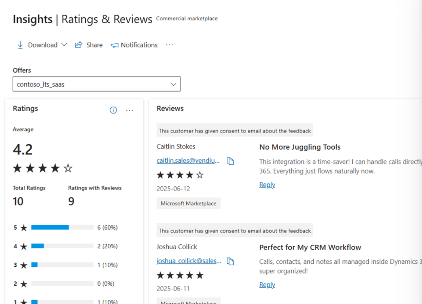 This article provides information on the Ratings and Reviews dashboard in Partner Center. This dashboard displays a consolidated view of customer feedback for offers on Microsoft Marketplace. As customers browse, search, and purchase offers in Microsoft Marketplace, they can leave ratings and reviews for the offers they acquired.