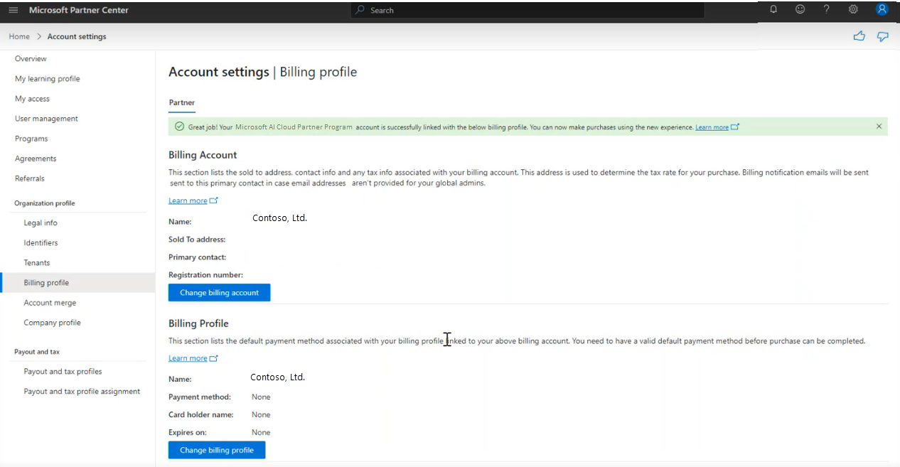 If you want to change an existing billing account and billing profile linked to your Partner Center account to another billing account or profile, you can do so on the Billing profile page. After the change, all your subsequent purchases reflect on the new billing profile.