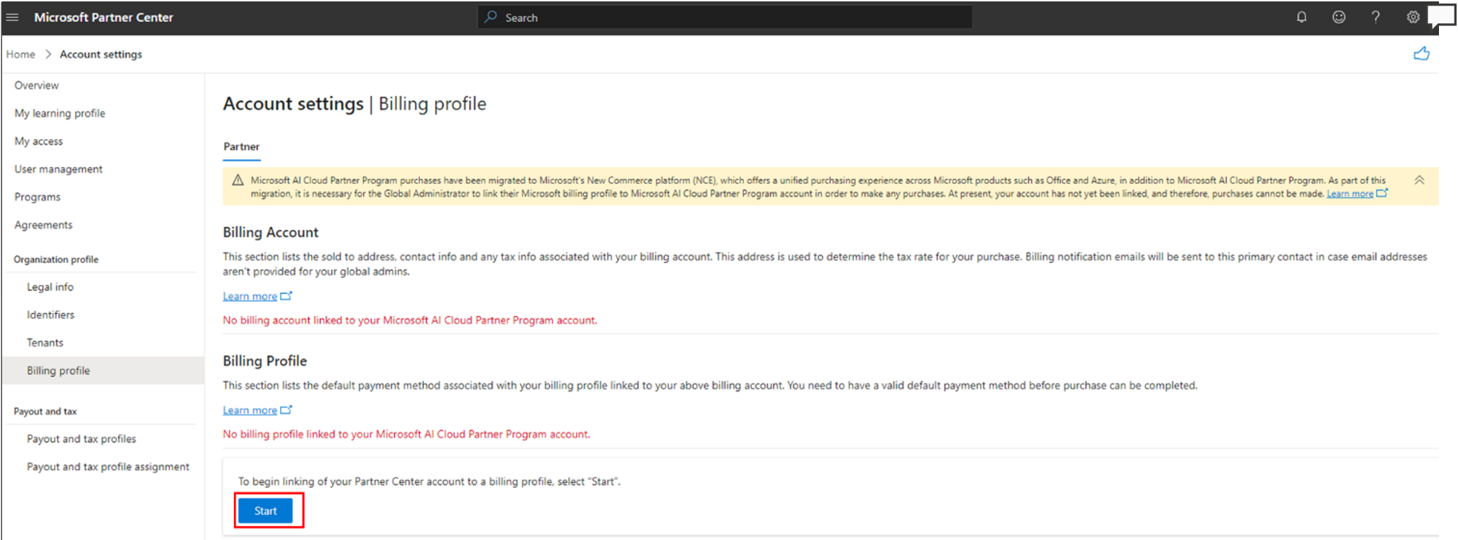 You receive an email from Microsoft and in-product notification that prompts you to link your Microsoft AI Cloud Partner Program Partner Center account to the Microsoft billing profile. Select Link Microsoft billing profile. Alternatively, you can start the process by selecting link Microsoft billing profile.