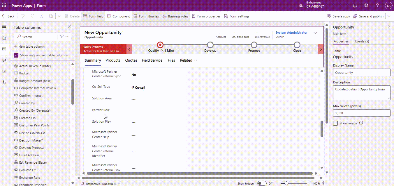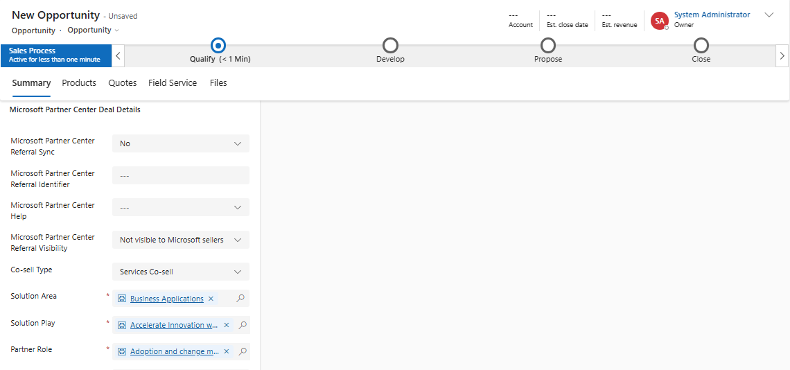 Microsoft Partner Center Solutions: A custom object to associate co-sell ready solutions or Microsoft solutions with the opportunity. One or more solutions can be added or removed from the opportunity. For ‘IP Co-sell', it's mandatory to add at least one co-sell ready or Microsoft solution to the opportunity before you sync with Partner Center. To associate this object to the opportunity, update the Opportunity form in the CRM.