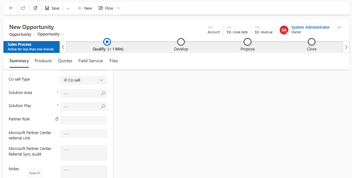 Sync with Partner Center: Whether to sync the opportunity with Partner Center. By default, the value of this field is No and needs to be explicitly set to Yes by your seller to share an opportunity with Microsoft. New referrals shared from Partner Center to CRM have this field value set to Yes. For Co-sell type ‘IP Co-sell', if there is no solution added to the opportunity, then this sync field is locked. You need to add at least one solution to set this field to Yes.