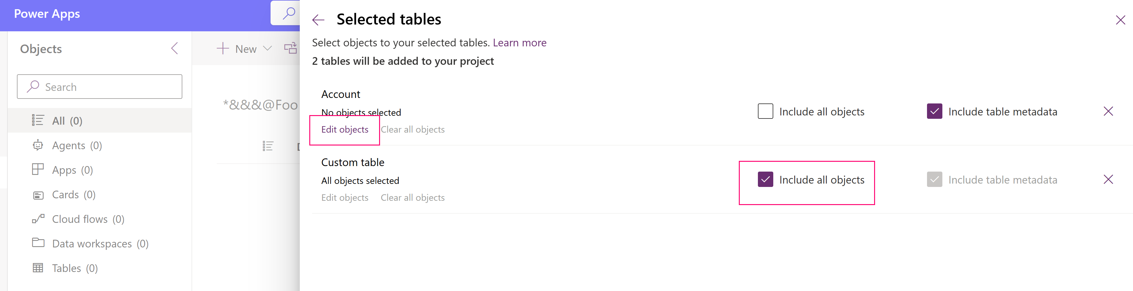 • Include all objects. This option includes all components and metadata associated with the table. It can include other tables or table components such as business process flows, reports, connections, and queues. For example, if the custom table has never been imported into the target environment, select this option. In this example, custom table has never been imported into the target environment, so select this option for Custom table.