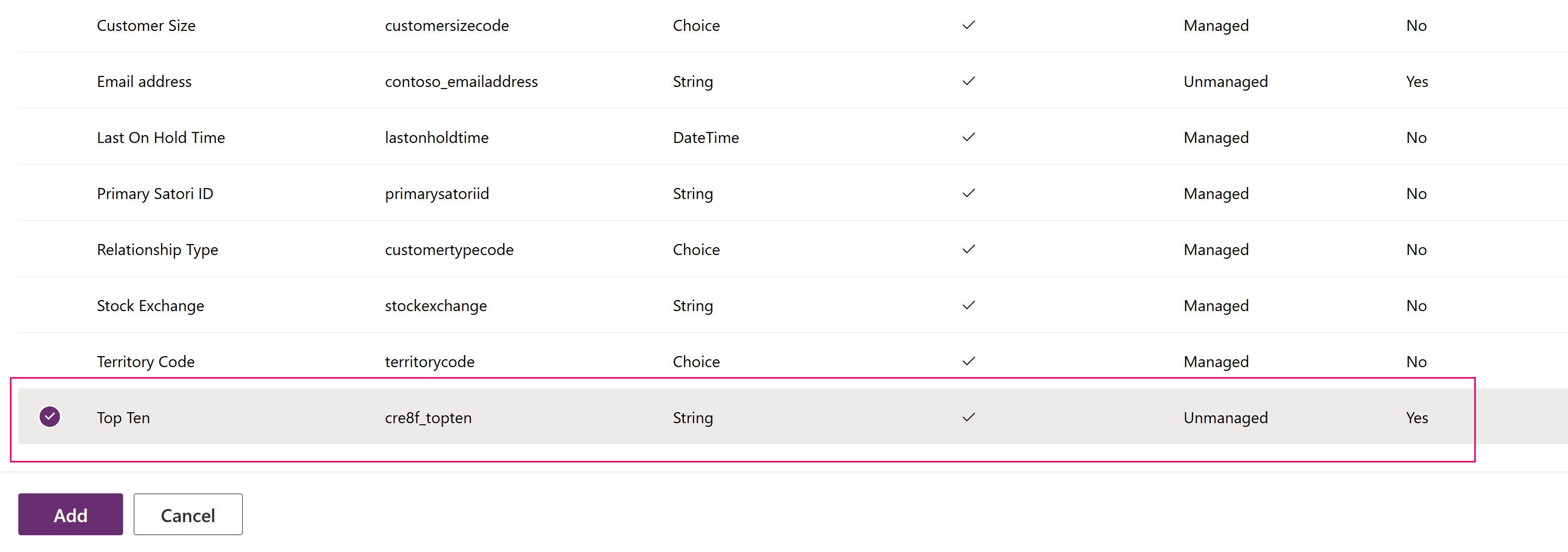 6. If you selected Edit objects, an object list pane opens. Here you can select the specific objects you want to include in the solution. In our example you selected the Account table earlier, so now you select the Top Ten column since that's the only new or edited component for the table, and then select Add. Select objects to include in the solution