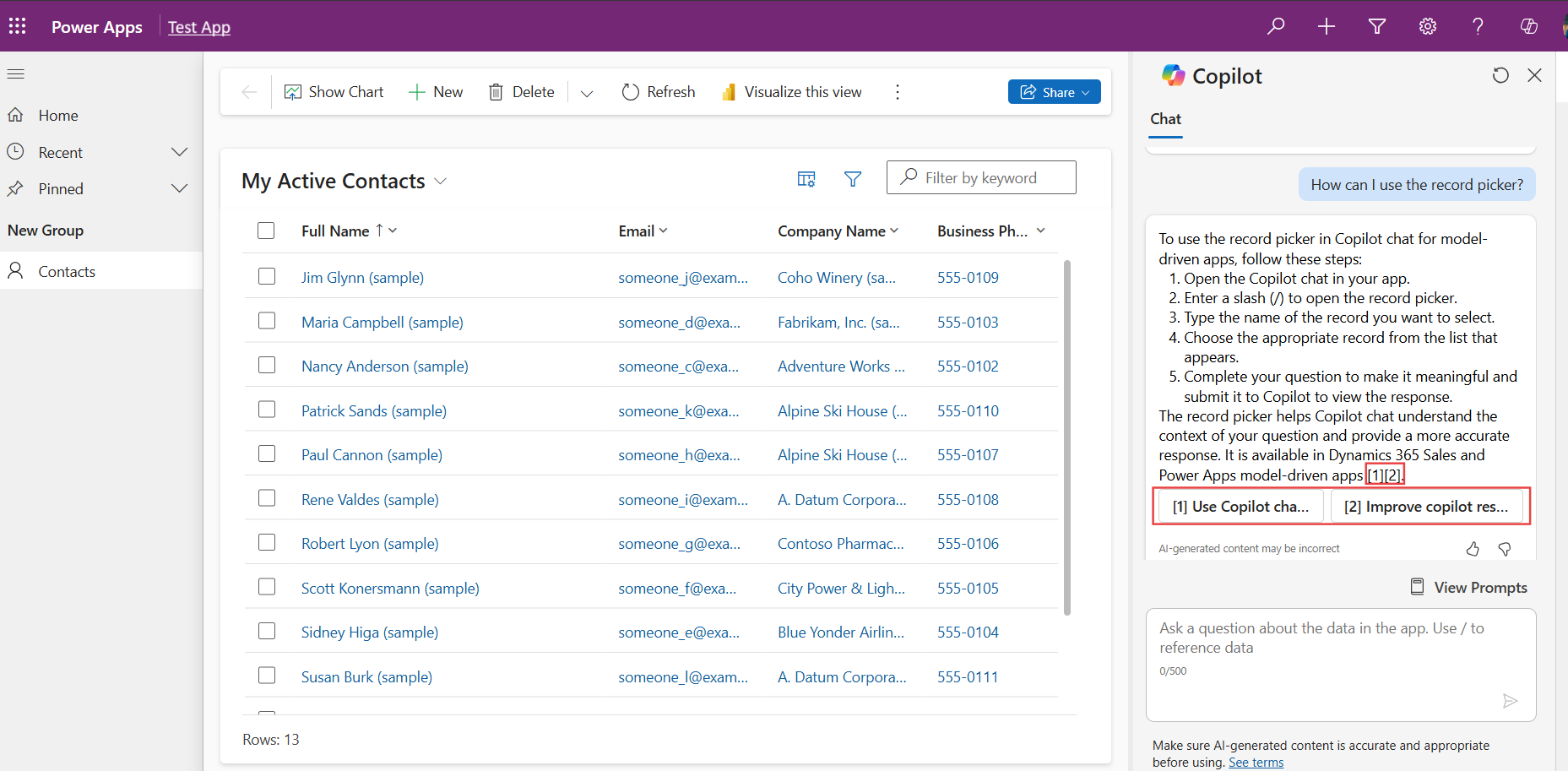 You can add additional knowledge sources in Copilot Studio. For example, you can add a link to an external public-facing website like Power Apps documentation by adding https://learn.microsoft.com/power-apps/ as knowledge to enable your Copilot chat to respond to questions related to creating apps in Power Apps. Another example is to upload your organization’s internal knowledge as a document to enable Copilot chat to respond to relevant queries that aren't a part of the app data.