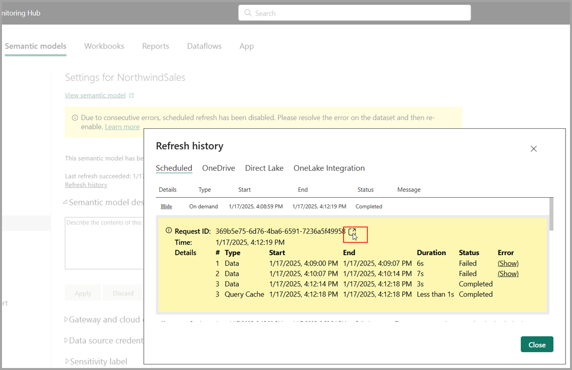 You can access semantic model refresh details from multiple locations: the Monitoring hub historical runs, semantic model refresh settings and semantic model detail page.