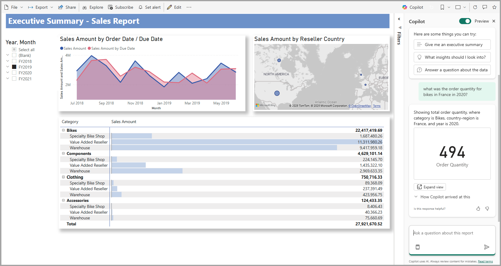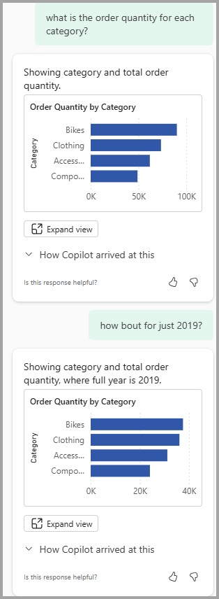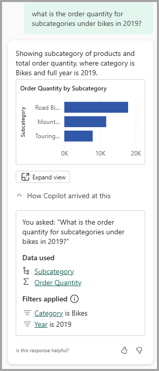 You can expand the “How Copilot arrived at this” dropdown to learn more about how Copilot understood your question, and to ensure the correct fields, measures, or filters were chosen from your model.
