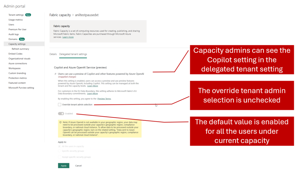 The cross-geo setting stays disabled and doesn't autodelegate to capacity administrators. Capacity administrators see the Copilot and Azure OpenAI Service (preview) settings under Capacity settings > Fabric capacity > Capacity name > Delegated tenant settings. By default, the capacity setting inherits tenant-level settings. Capacity administrators can decide whether to override the tenant administrator’s selection. This means that even if Copilot isn't enabled on a tenant level, a capacity administrator can choose to enable Copilot for their capacity. With this level of control, it's easier to control which Fabric workspaces can use AI features like Copilot in Microsoft Fabric.