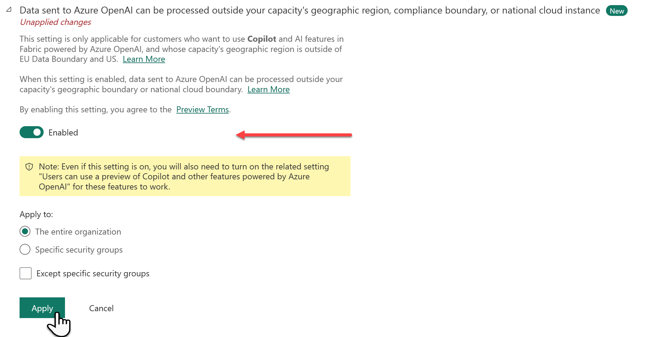 - If you're okay with your data being handled outside of your area, switch on the setting Data sent to Azure OpenAI can be processed outside your capacity's geographic region, compliance boundary, or national cloud instance, and select Apply.