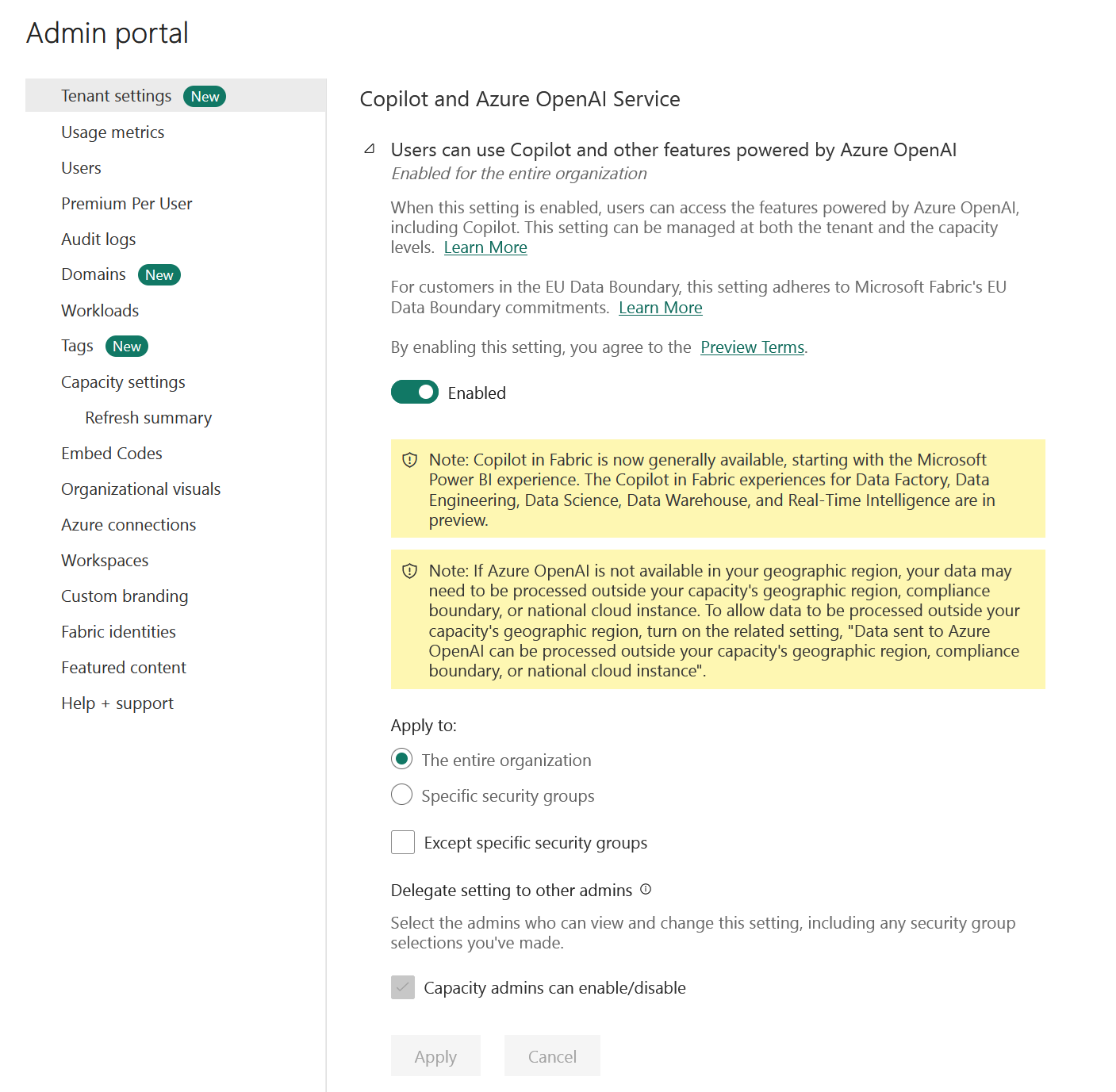 In the tenant admin portal, admins can delegate the enablement of AI and Copilot features to capacity administrators. This AI and Copilot setting is automatically delegated to capacity administrators; tenant administrators can't turn off the delegation.