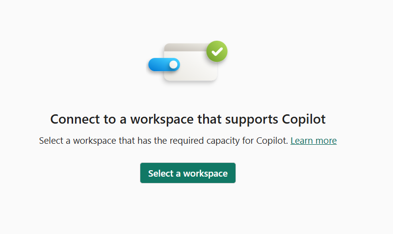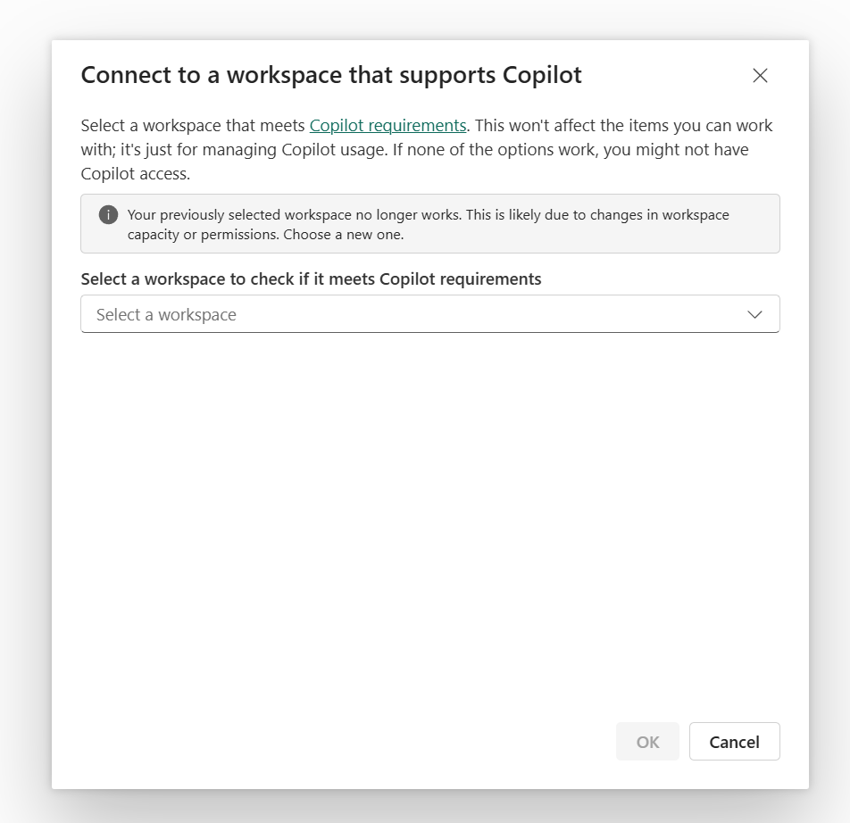 When you use the standalone Copilot experience and don't have access to a Fabric Copilot capacity, select a workspace that has the required capacity for Copilot.