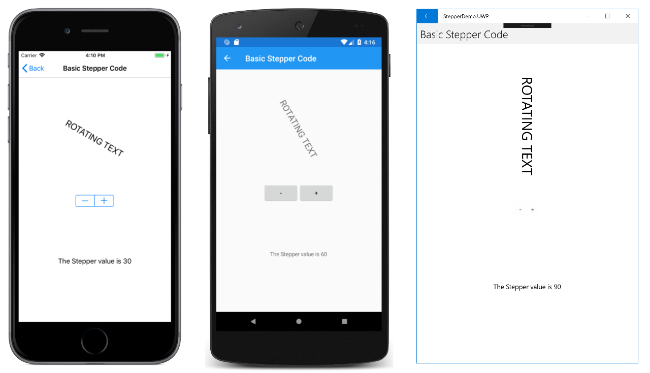 The Stepper is initialized to have a Maximum property of 360, and an Increment property of 30. Manipulating the Stepper changes the selected value incrementally between Minimum to Maximum based on the value of the Increment property. The ValueChanged handler of the Stepper uses the Value property of the stepper object to set the Rotation property of the first Label and uses the string.Format method with the NewValue property of the event arguments to set the Text property of the second Label. These two approaches to obtain the current value of the Stepper are interchangeable.