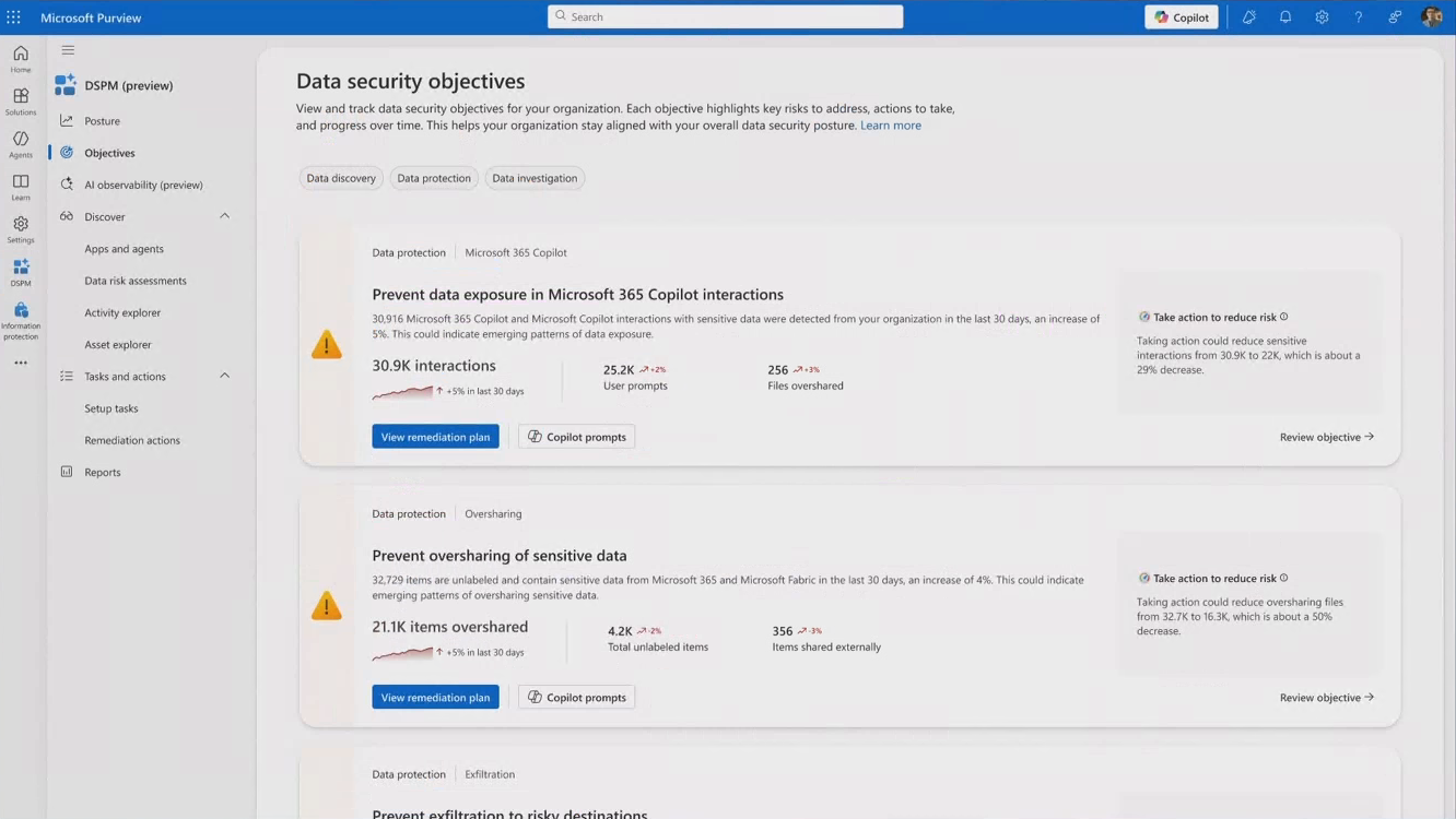 Objectives: Data security objectives to help you address data security risks that have been identified for your organization, each with a remediation plan that includes one-click policies and recommended actions.