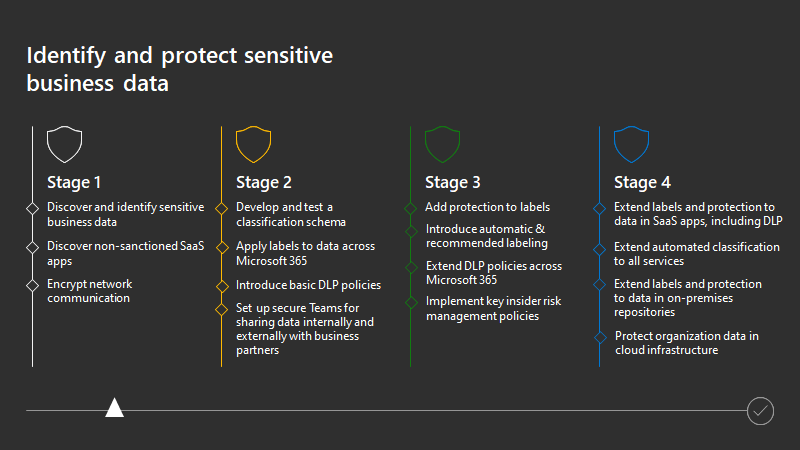 For example, Microsoft Defender for Cloud Apps helps you identify SaaS apps you might not have been aware of. The work of discovering where your sensitive data resides begins in Stage 1 of the technical implementation and cascades through all four stages.